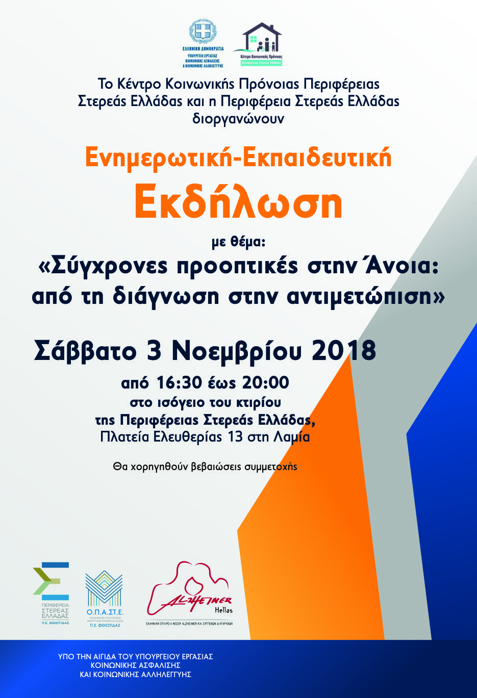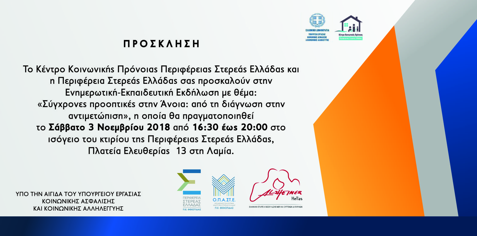 Συγκεκριμένα, το Σάββατο 3 Νοεμβρίου 2018, 16:30 (4 και μισή το απόγευμα) στο ισόγειο του νεοκλασικού κτιρίου της Περιφέρειας Στερεάς Ελλάδος (Πλατεία Ελευθερίας 13), ο περιφερειακός οργανισμός παροχής υπηρεσιών κοινωνικής φροντίδας του Υπουργείου Εργασίας Κοινωνικής Ασφάλισης & Κοινωνικής Αλληλεγγύης και η Περιφέρεια Στερεάς Ελλάδος, συνδιοργανώνουν εκδήλωση με θέμα: «Σύγχρονες προοπτικές στην άνοια: Από τη διάγνωση στην αντιμετώπιση».