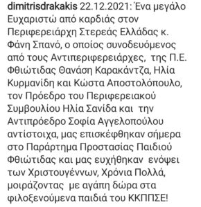 Επίσκεψη του Περιφερειάρχη Στερεάς Ελλάδας κ. Φάνη Σπανού ενόψει των Χριστουγέννων, στο Παράρτημα Προστασίας Παιδιού Φθιώτιδας 22 Δεκεμβρίου 2021 Ο Πρόεδρος του Κ.Κ.Π. Περιφέρειας Στερεάς Ελλάδας Δημήτριος Ν. Δρακάκης