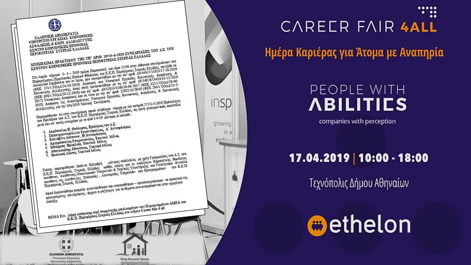 Κατόπιν σχετικής ομόφωνης απόφασης του Διοικητικού Συμβουλίου του Κέντρου Κοινωνικής Πρόνοιας Περιφέρειας Στερεάς Ελλάδας, ωφελούμενοι του Παραρτήματος Ατόμων με Αναπηρία Ευβοίας, θα παρευρεθούν στο φεστιβάλ καριέρας για τα Άτομα με Αναπηρία Career Fair.4 All, που διοργανώνεται κάθε χρόνο από την Ethelon.